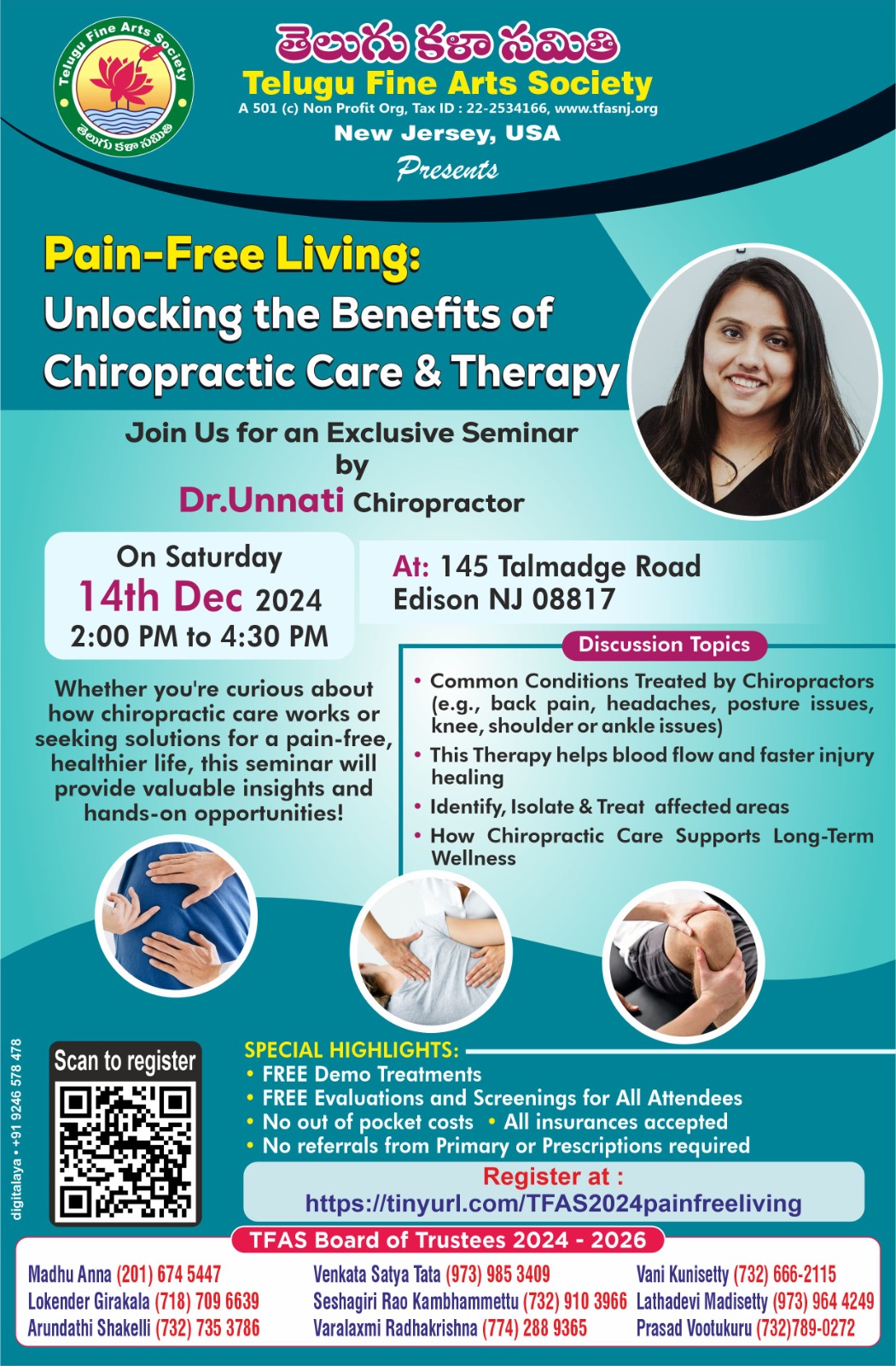 13.TFAS-How to live Pain Free by Dr.Unnati,Chiroproctor at 145 Talmadge Road, Edison on December 14th 2024