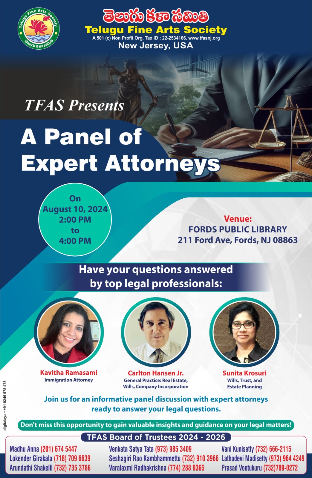 5. TFAS Legal Seminar By A Panel of Attorneys, at Fords Public Library, Fords NJ on August 10th 2024