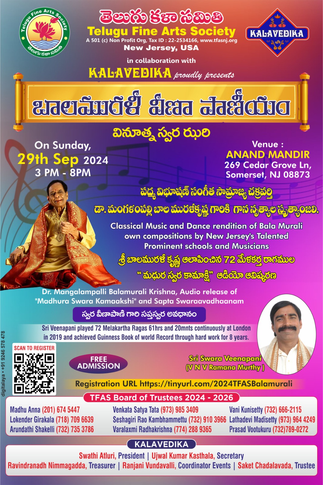 9. TFAS TRIBUTE TO MANGALAMPALLI BALAMURALIKRISHNA at Ananda Mandir, Somerset NJ on September 29th 2024